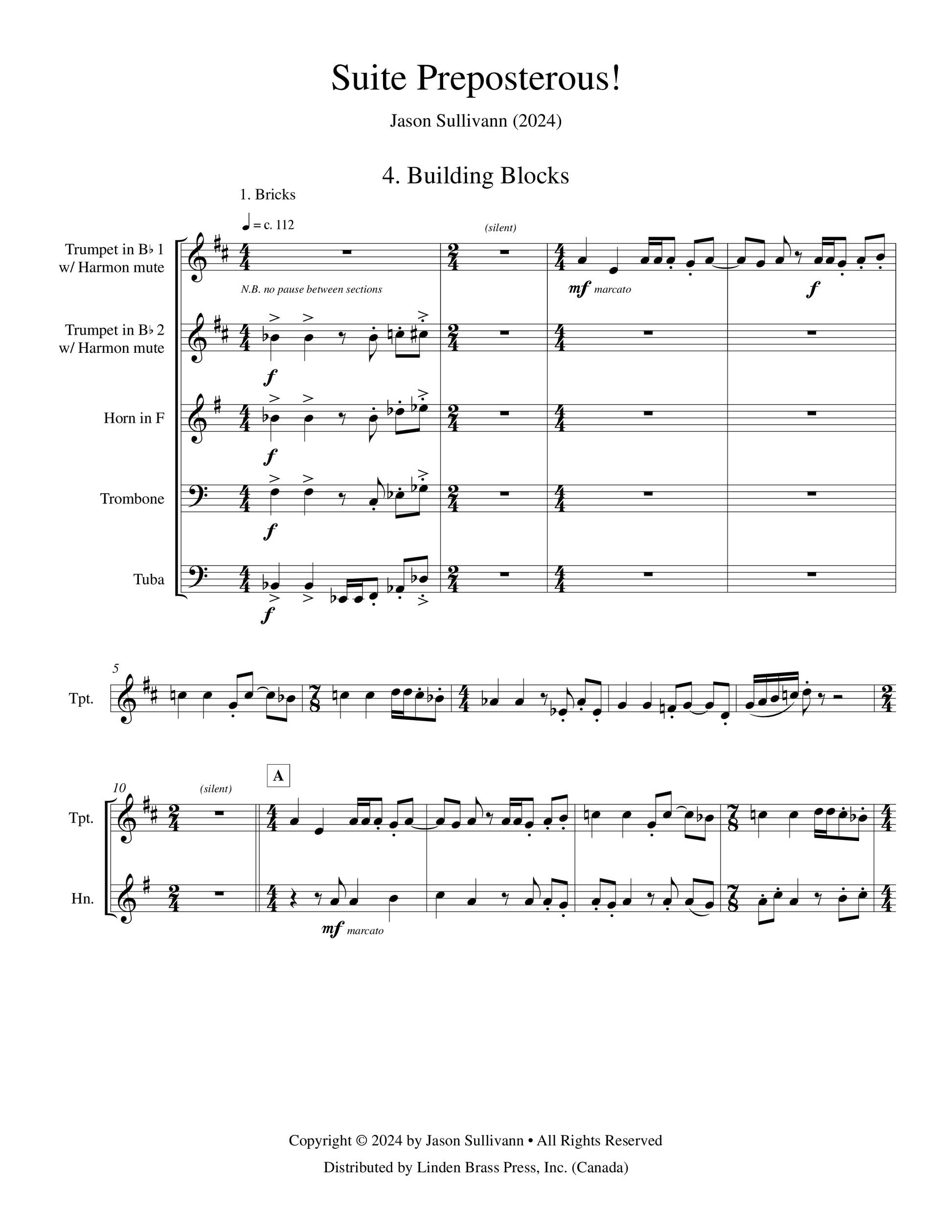 Building Blocks is the fourth movement of Suite Preposterous! by composer Jason Sullivann. The movement is in three main sections: 1. Bricks, 2. LEGO®, and 3. Bytes.