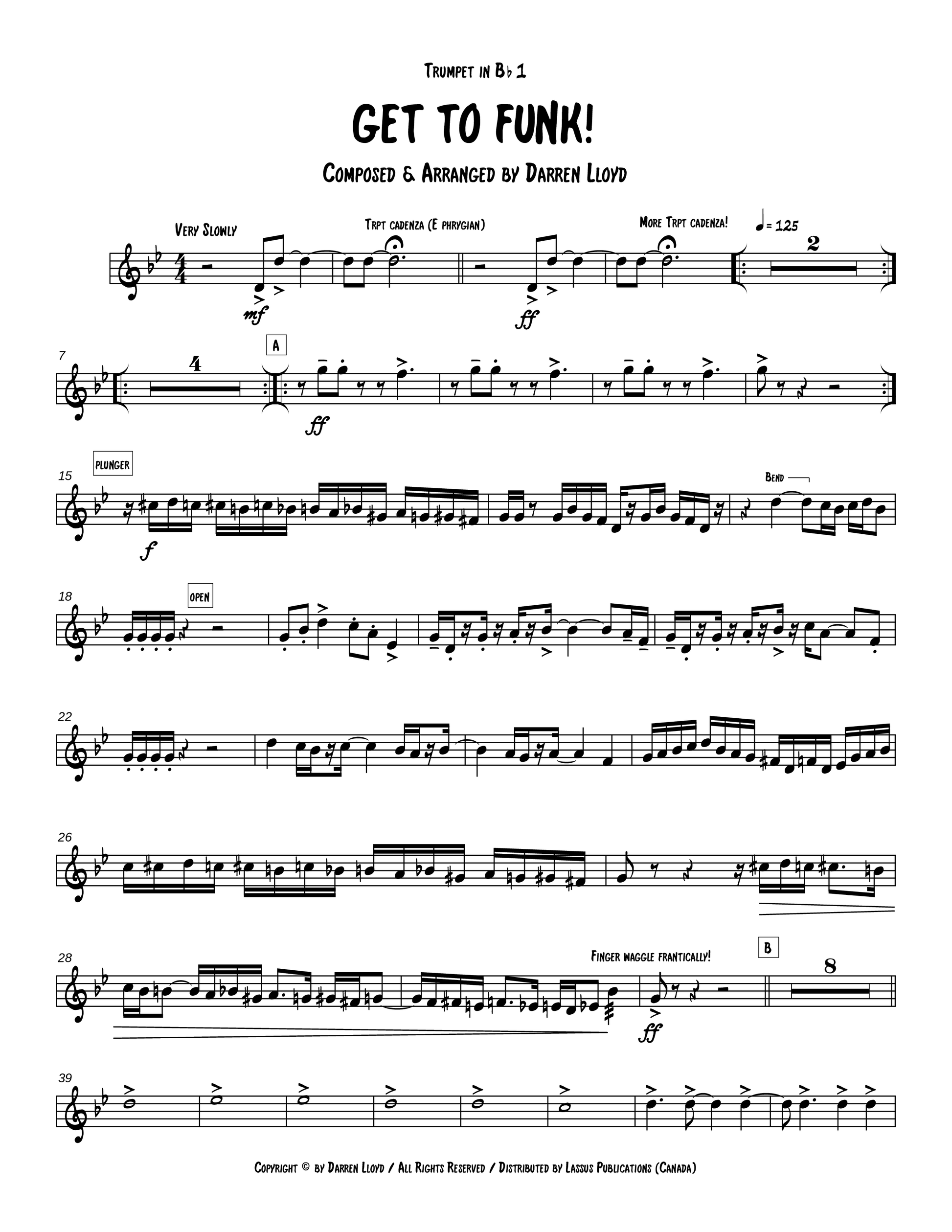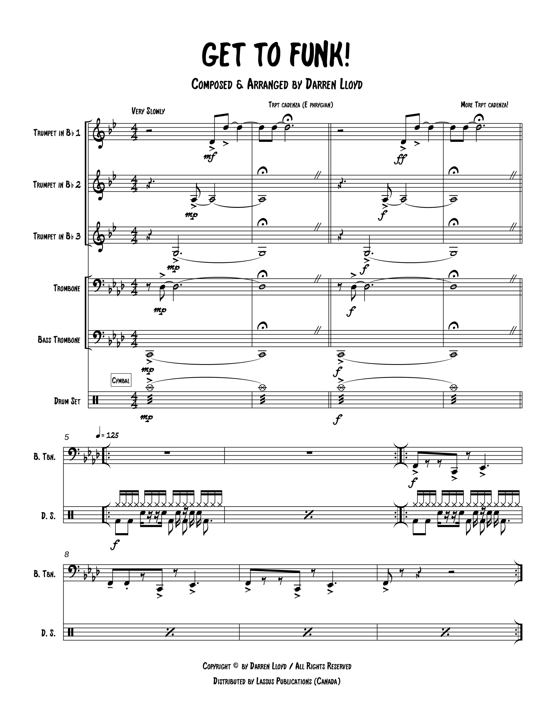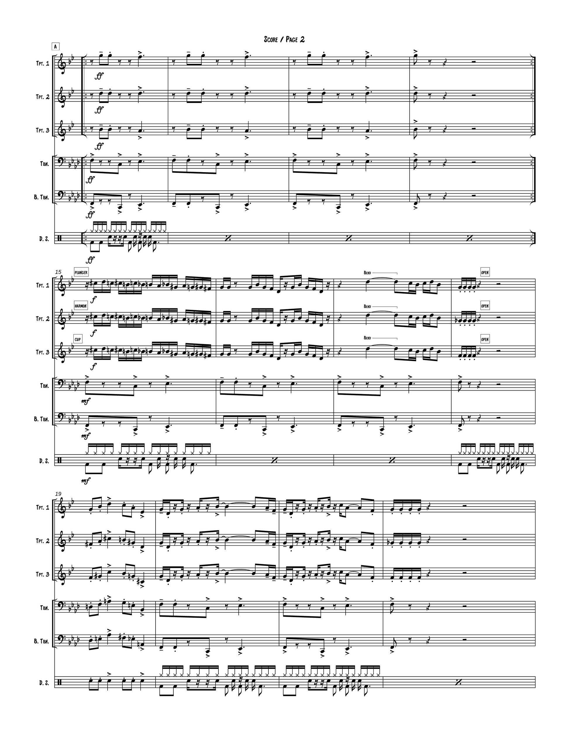 Three trumpets (Bb), trombone, bass trombone, drum set
