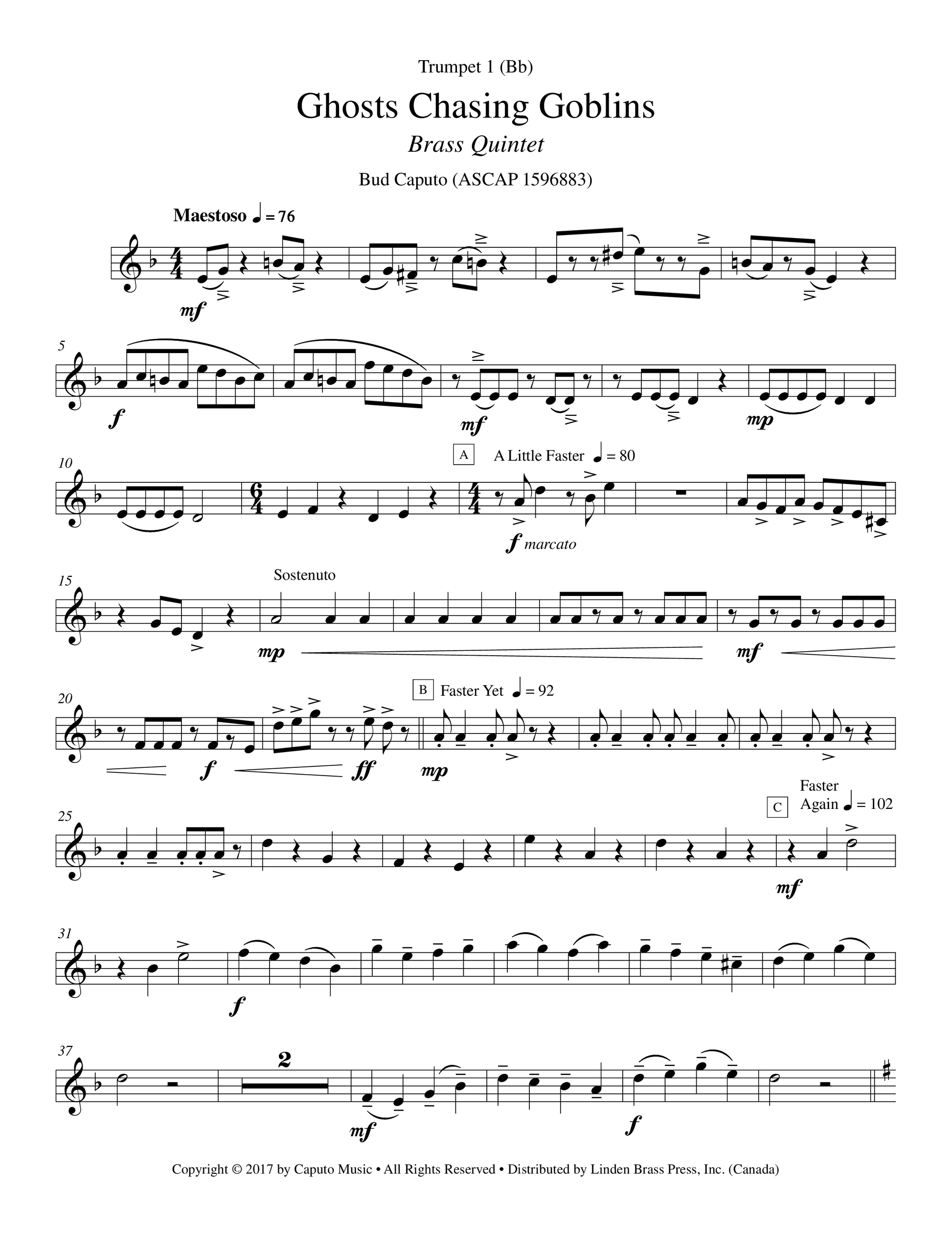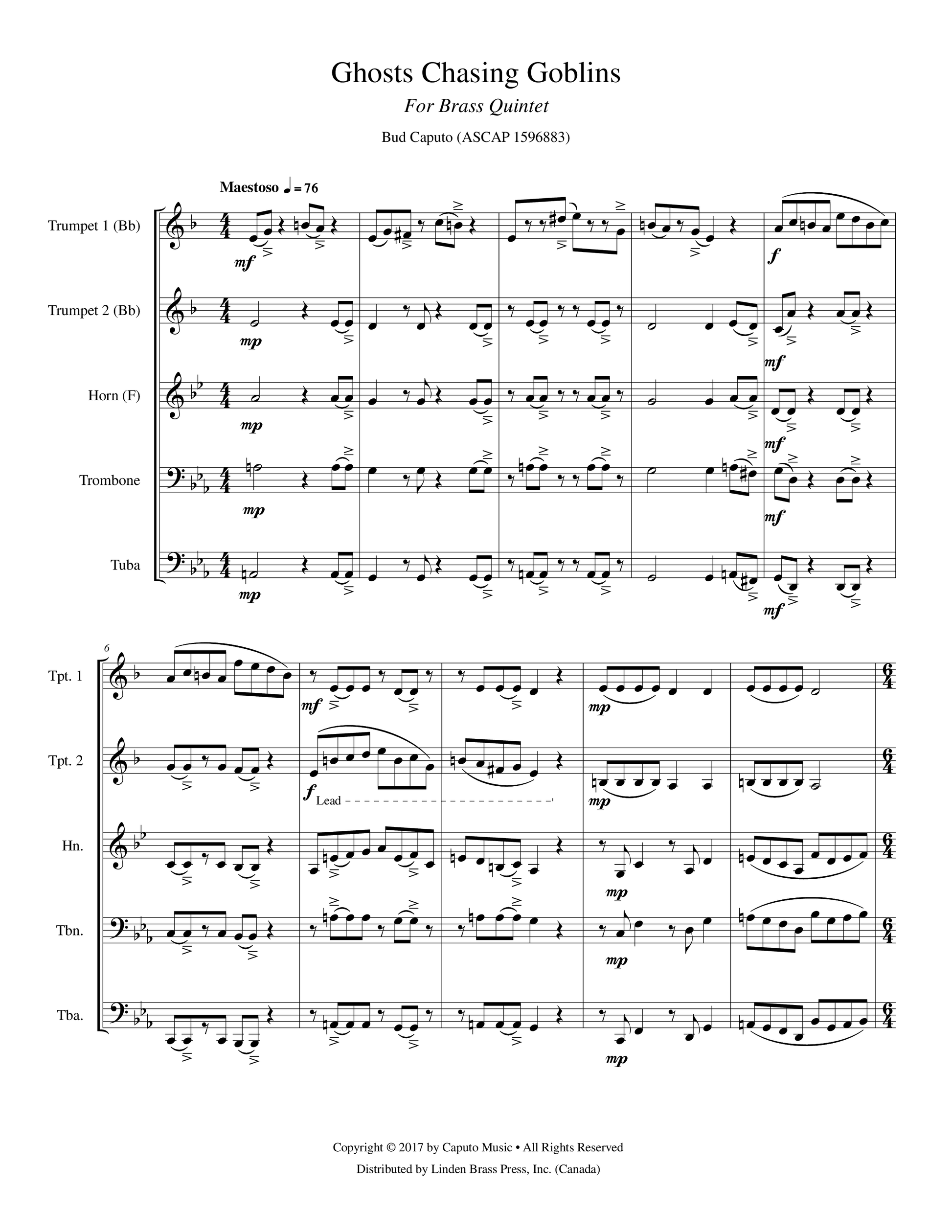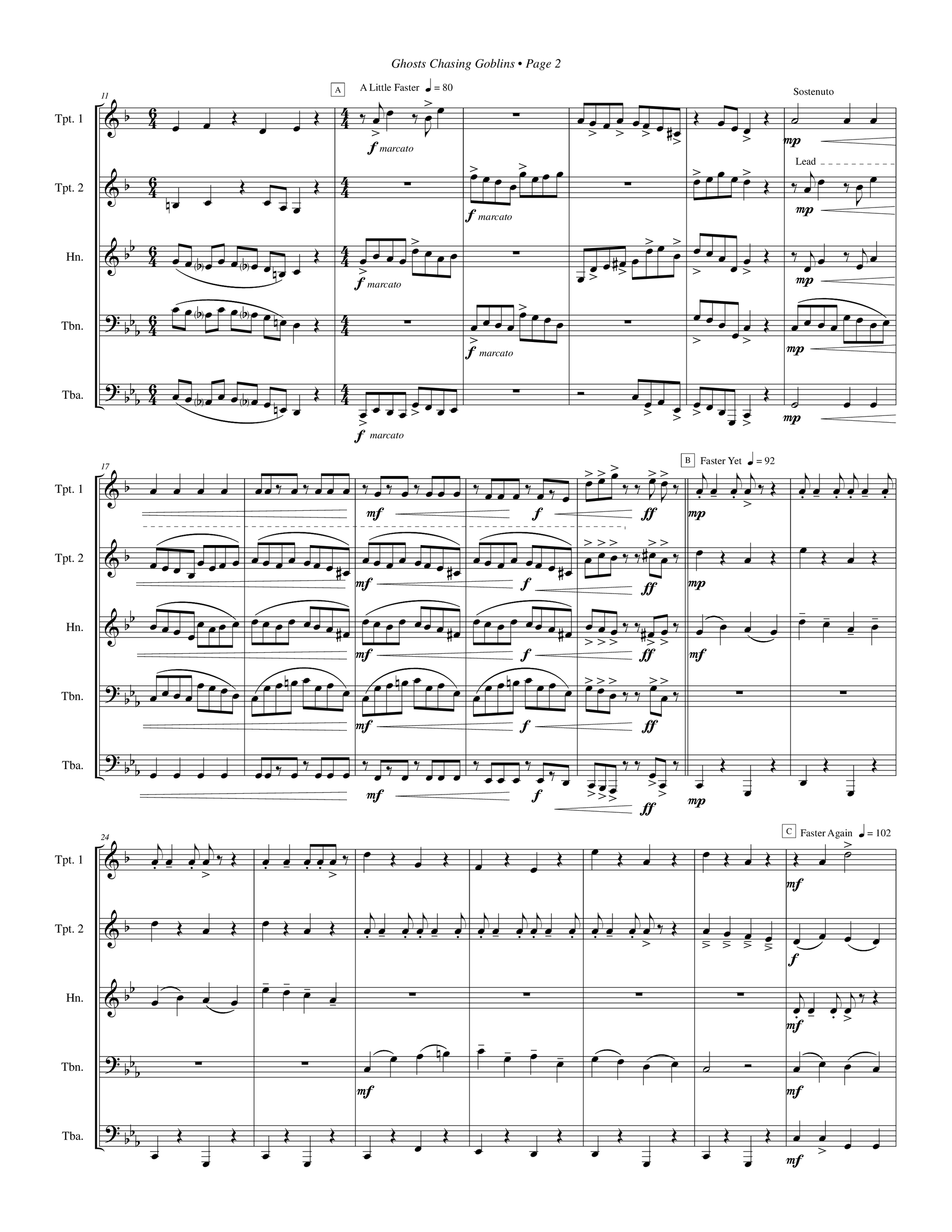 A Halloween flavored piece for two trumpets (Bb), horn or trombone, trombone, and tuba