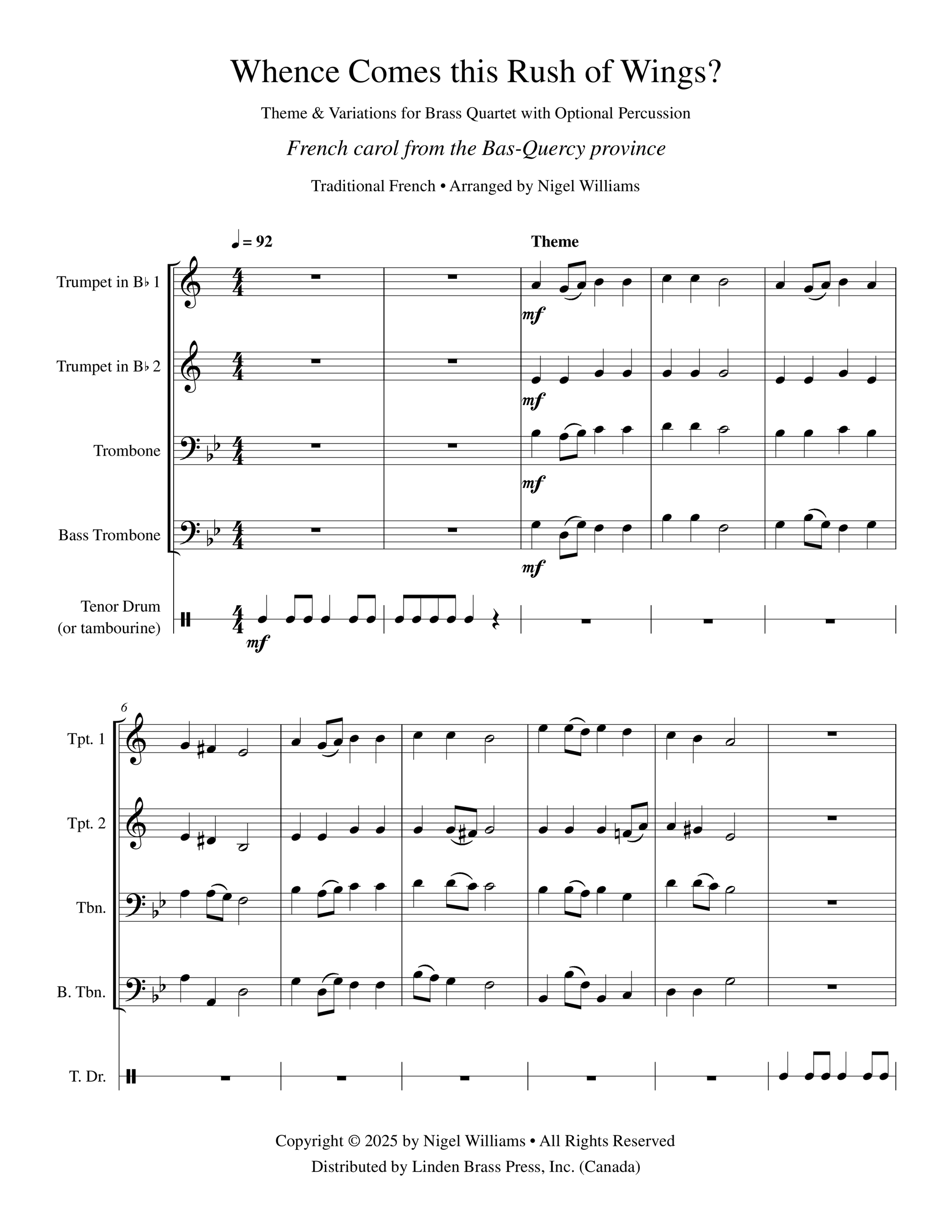 The tune cries out for a Renaissance brass treatment, so here it is for quartet with optional tenor drum or tambourine. The percussionist could easily improvise the part, playing wherever appropriate or between the variations. Any handheld percussion instrument would work.
